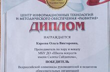 Поздравляем преподавателя Кареву Ольга Викторовну с Дипломом Победителя Всероссийской олимпиады "Патриотическое воспитание в системе дополнительного образования детей".