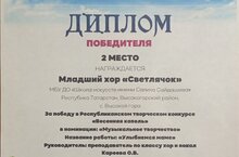 Младший хор "Светлячок" с Дипломом Победителя 2 место в номинации "Музыкальное творчество" Республиканского творческого конкурса "Весенняя капель".