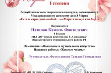 Галиуллину Дину (преп. Газизов А. М.) с Дипломом II степени Республиканского творческого конкурса, посвященного 8 марта!