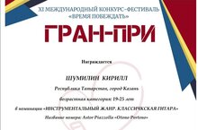 Шумиллин Кирилл Сергеевич участвовал в международном фестивале "Время побеждать" и выиграл диплом уровня "Гран-При"