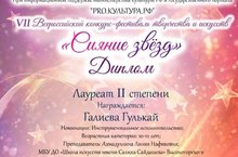 В Vll Всероссийском конкурсе "Сияние звезд"в номинации народные инструменты учащаяся преподавателя Ахмадуллиной Л. Н Дубьязской школы искусств Галиева Гулькай стала лауреатом ll степени! Поздравляем!