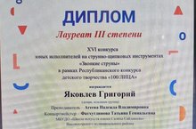 Поздравляем Яковлева Григория, ставшего Лауреатом III степени XVI конкурса юных исполнителей на струнно-щипковых инструментах "Звонкие струны" в рамках Республиканского конкурса детского творчества "100/ЛИЦА". Преподаватель Агеева Надежда Владимировна и концертмейстер Фатхутдинова Татьяна Геннадьевна были награждены Благодарственными письмами.