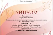 Поздравляем Кондра Агату, преподаватель Солкина Н. Н. с дипломом Лауреата III степени Международного конкурса инструментального исполнительства "SOLO PERFORMANCE". Преподаватель Наталия Николаевна была награждена Благодарственным письмом.