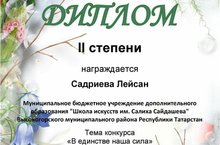 Поздравляем Садриеву Лейсан, преп. Нугманова Л. И., с Дипломом II степени открытого Всероссийского конкурса художественного творчества "Моя страна - моя Россия"!!!
