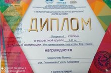Поздравляем с очередной победой Гаврильчеву Полину (преп. Гильманова Гуузель Забировна) - Лауреат I степени на II Международном конкурсе по игре на фортепиано "SUPER ACCORD", г. Санкт - Петербург.
