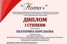 Поздравляем Екатерину Корсакову (преп. Нуриева А. А.) с Дипломом 1 степени II Международного конкурса по сольфеджио и композиции среди обучающихся детских музыкальных школ, детских школ искусств и иных образовательных учреждений "Нота+".