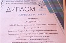 Поздравляем Сводный хор преподавателя Кареевой О.В.,ставших Лауреатом II степени VII Международного разножанрового конкурса- фестиваля "Сияние звёзд"! Молодцы! Желаем новых творческих побед!