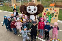 Сегодня в день защиты детей уже с утра наших малышей и их родителей встречали весёлые герои любимых мультфильмов: три кота, Чебурашка и Шапокляк.