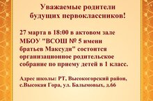 Уважаемые родители будущих первоклассников!27 марта в 18:00 в актовом зале МБОУ "ВСОШ №5 имени братьев Максуди" состоится организационное родительское собрание по приему детей в 1 класс. Адрес школы: РТ, Высокогорский район, с.Высокая Гора, ул.Балымовых, д.66