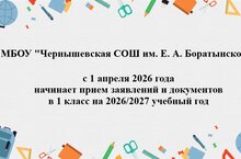 Информируем вас о том, что с 1 апреля 2026 года в МБОУ "Чернышевская СОШ им. Е.А. Боратынского" начинается прием заявлений и документов для зачисления детей в первый класс на 2026-2027 учебный год.