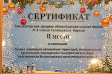 Наша школа получила 2 место в номинации "Лучшее новогоднее оформление территорий,фасадов зданий организаций, учреждений и предприятий всех форм собственности Высокогорского муниципального района".