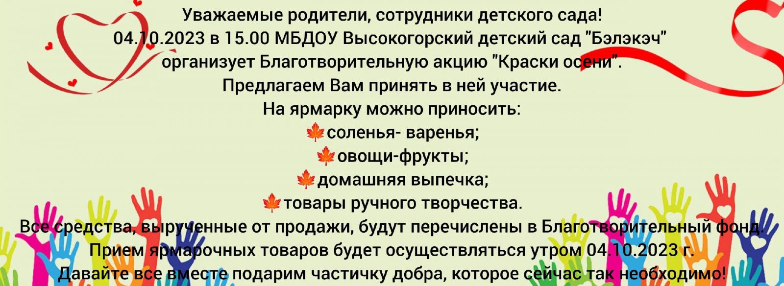Дорогие родители и сотрудники детского сада! Хочется выразить огромную благодарность, каждому, кто пришел 04.10 на благотворительную ярмарку! Спасибо за ваше участие и за вашу помощь