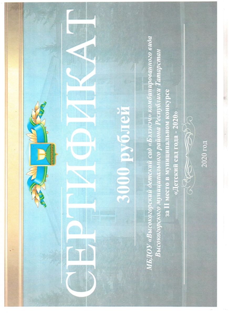 Сертификат за 2 место в муниципальном конкурсе "Детский сад года - 2020"