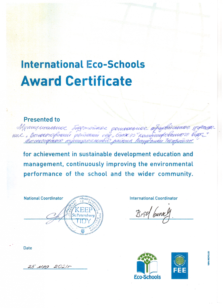 Сертификат участия в международной программе "Эко/школа - 2021"