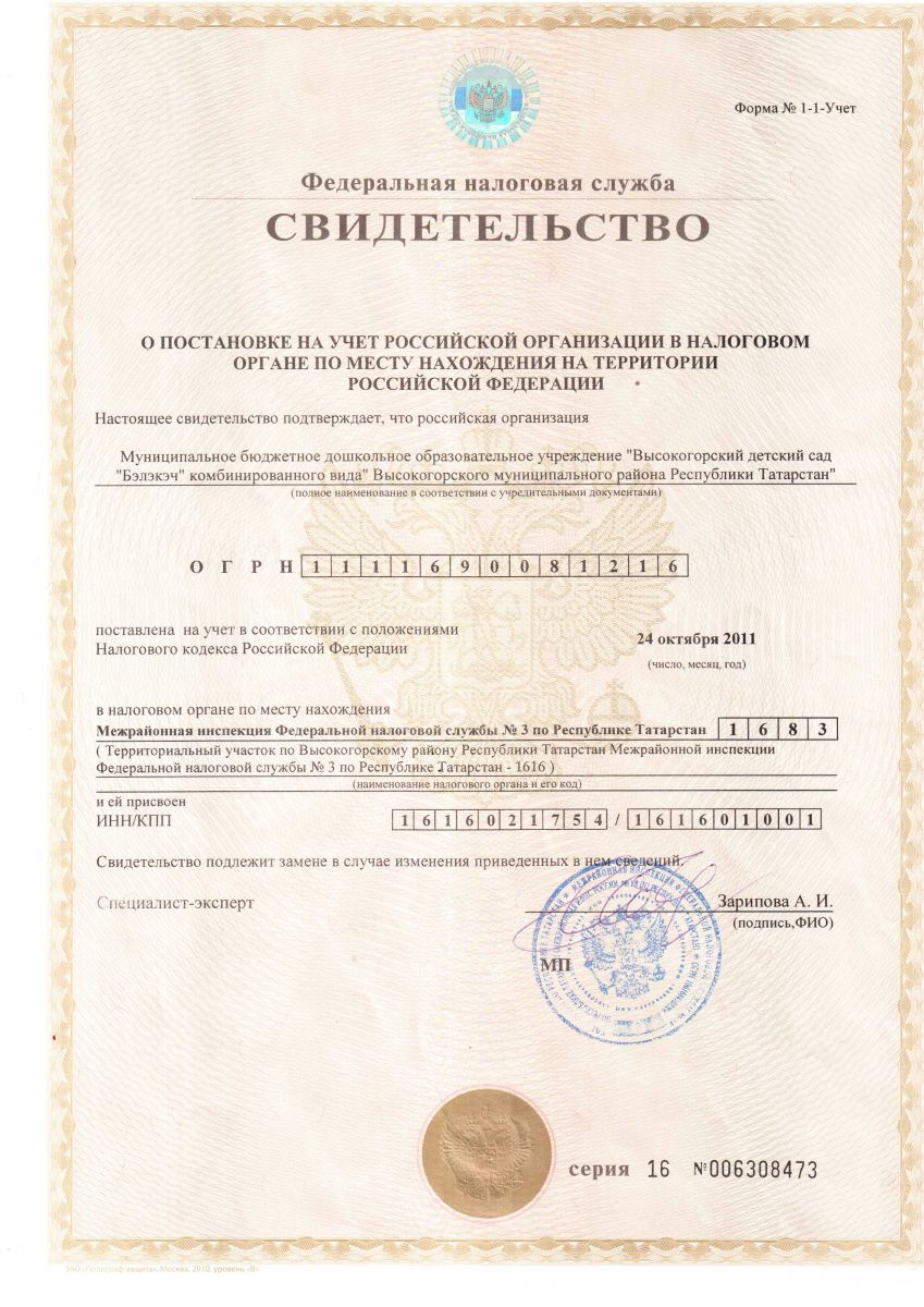 Свидетельство о постановке на учет в налоговом органе