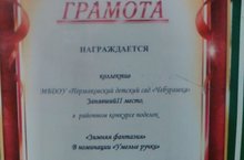 Грамотой наградили коллектив нашего детского сада, занявший 2 место в районном конкурсе поделок "Зимняя фантазия" в номинации "Умелые ручки" МОЛОДЦЫ!!!! Так держать...