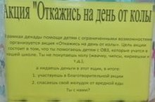 В преддверии декады инвалидов в школе объявлена акция "Откажись от колы". Средства, вырученные с акции будут направлены на помощь детям с овз нашей школы