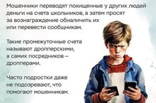 Использование банковской карты ребёнка для переводов чужих денег — одна из распространённых схем интернет-мошенничества. Подросткам могут предложить «помочь», «пропустить перевод» или «временно воспользоваться картой», обещая вознаграждение.