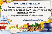 Прием заявлений по поступлению учащихся в 1 класс на 2020-2021 учебный год завершен в связи с отсутствием свободных мест.
