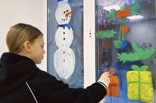 Ребята подошли творчески к оформлению оконных стекол. Здесь были изображены забавные персонажи и изящные снежинки.