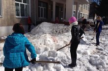 Ученики с 5 по 11 классов вместе с учителями вышли на субботник: очищали от снега территорию школы.