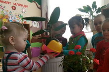 С целью ознокомления детей с комнатными растениями и уходом за ними во второй группе раннего возраста дети вместе с воспитателем Яруллиной А.Р. вытирали пыль с листьев фикуса и герани.