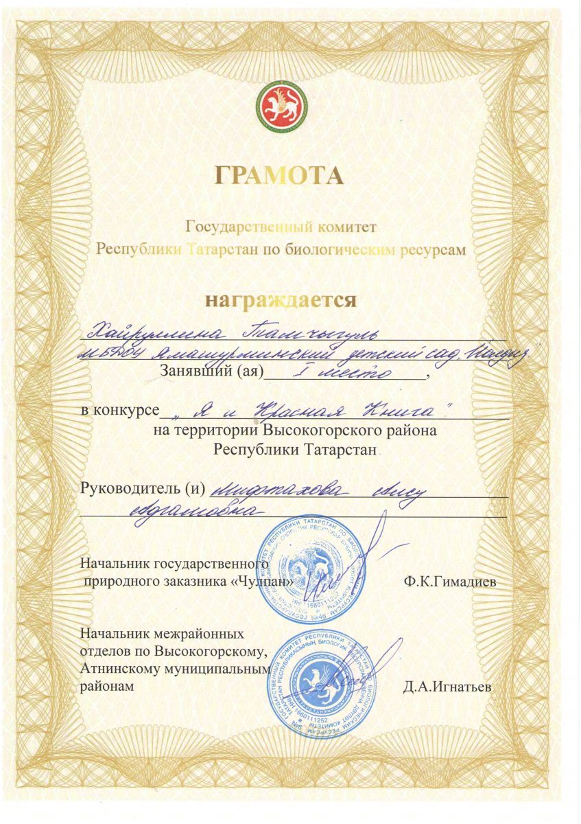 Калимуллин Нурфаэль Р. "Кызыл китап "конкурсында катнашышып грамота ( 3нче урын) белән бүләкләнде /Калимуллин Нурфаэль Р. награжден грамотой за 3 е место в конкурсе "Красная книга"