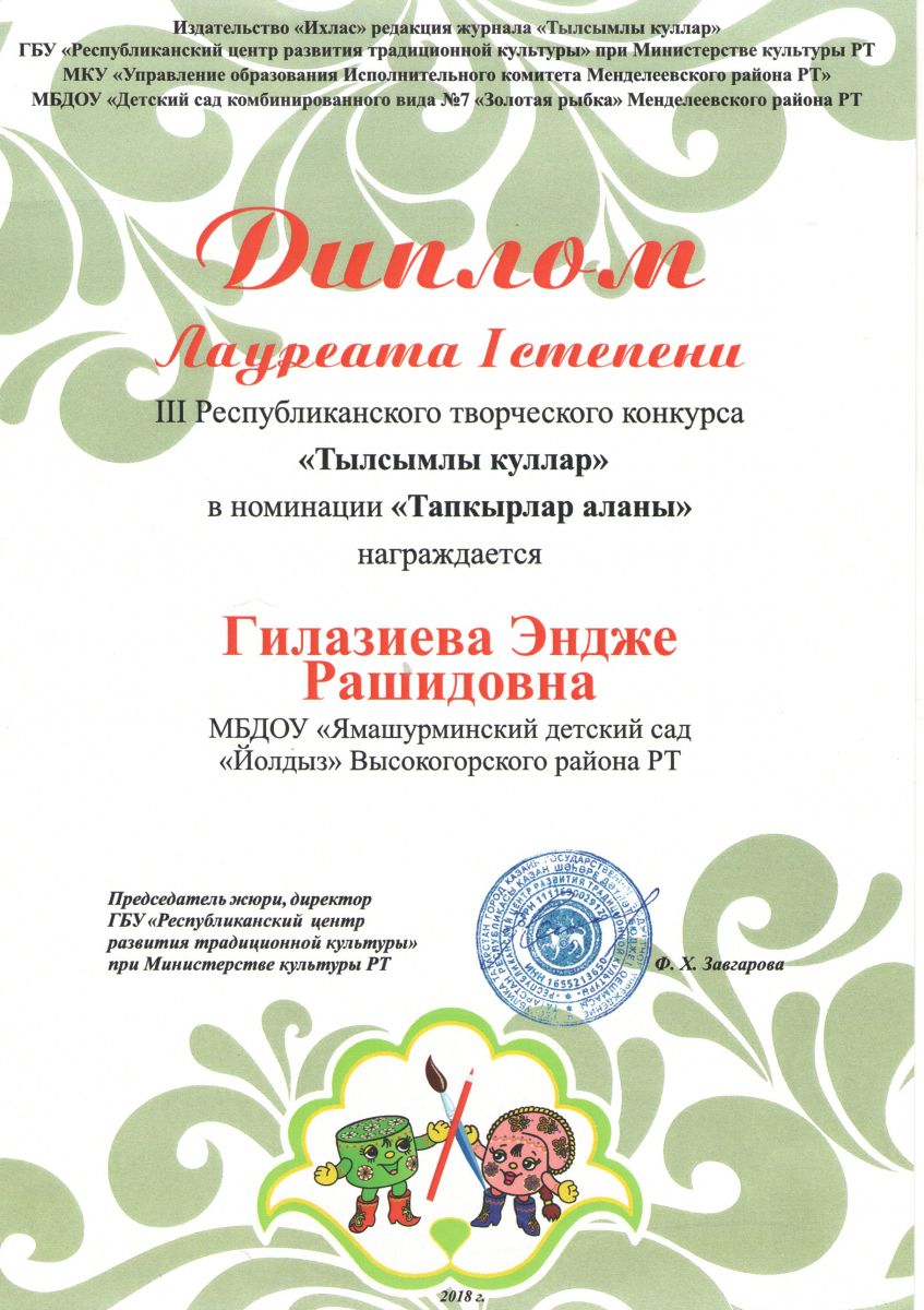 Зурлар катнаш төркеме тәрбиячесе Гыйлаҗиева Энҗе Рәшит кызын III Республикакүләм «Тылсымлы куллар» иҗади конкурсының "Тапкырлар аланы" номинациясендә I дәрәҗә Лауреат Дипломы алуы белән котлыйбыз.Сезгә киләчәктә дә яңа җиңүләр, нык сәламәтлек һәм эшегездә уңышлар телибез!