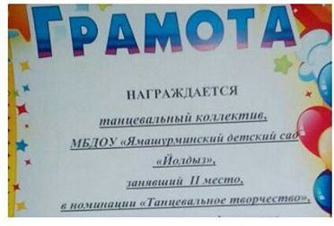 Биектау Мәдәният йортында уздырылган "Кораблик детства" фестиваленең гала-концертында безнең бакчадан зурлар катнаш төркеме балалары феерлар белән бию башкарып, район балалар бакчалары бию коллективлары арасында икенче урын алдылар. Музыка җитәкчесе Лилия Альберт кызына сәламәтлек, иҗат уңышлары теләп калабыз. Балаларга һәм музыка җитәкчесенә рәхмәтебезне белдерәбез.