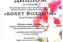 "Бәхет йолдызы"республика фестиваль -конкурсында вокал-соло номинациясендә 3 нче дәрәҗә диплом алган Валиуллина Элина Илнар кызын һәм музыка җитәкчесе Сафиуллина Лилия Альберт кызын чын күңелдән котлыйбыз. Аларга киләчәктә иҗади уңышлар телибез.