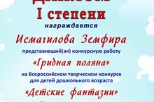 Зурлар катнаш төркемендә йөрүче Исмагилова Земфира Илмас кызы тәрбичесе Асылгариева Альбина Альфред кызы белән Бөтенроссия иҗади конкурста "Гөмбәле алан"дигән кул эше белән катнашып, беренче дәрәҗә диплом белән бүләкләнделәр. Җиңүләре белән котлыйбыз һәм иҗади уңышлар телибез.