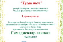 Бакчабыз тәрбияләнүчесе Гыймадиев Раяз үзенең гаиләсе белән берлектә Түбән Кама шәһәрендә үткәрелгән "Туган тел" республикакүләм бәйгедә катнашты. Гыймадиевлар гаиләсе "Халык фольклоры" номинациясендә 1 нче урынга лаек булды. Раязны чын күңелдән котлыйбыз! Алга таба да зур уңышларга ирешүен телибез!