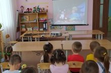 Йомгак итеп балалар белән иллюстрацияләр буенча халык әкиятләре персонажларын искә төшердек.Балаларга мультфильмнарны зур экраннан карау бик ошый."Сказка-это семя, из которого вырастает эмоциональная оценка жизненных явлений ребенка».