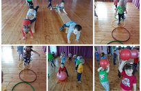 Во второй разновозростной группе повторили навыки ползание в скамейке, прыжки из круга в круг, ловля мяча