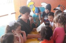 6 май кәнне уртанчылар - зурлар катнаш төркеме балалары китапханәче Назмиева Фәридә апа белән очраштылар. Фәридә апа бу очрашуда балаларны Бөек Ватан сугышы темасына багышланган китаплар белән таныштырды. Шушы темага әңгәмә үткәрде һәм хикәяләр укыдылар.
