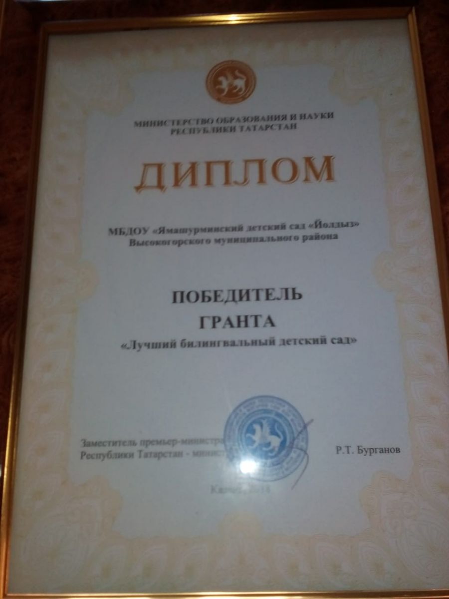 Министерство образования и науки Республики Татарстан в целях выявления и поощрения лучших педагогических коллективов дошкольных образовательных организаций, обеспечивающих высокое качество билингвального образования дошкольников, учредил грант «Лучший билингвальный детский сад». 27 июня во время секции республиканского совещания работников образования и науки , который организовал Кукморский муниципальный район были подведены итоги конкурсного отбора соискание гранта “Лучший билингвальный детский сад”. В конкурсе по республике участвовали 82 дошкольные образовательные организации, обладателями гранта стали 30 лучших детских садов. МБДОУ Ямашурминский детский сад «Йолдыз» - победитель гранта «Лучший билингвальный детский сад».