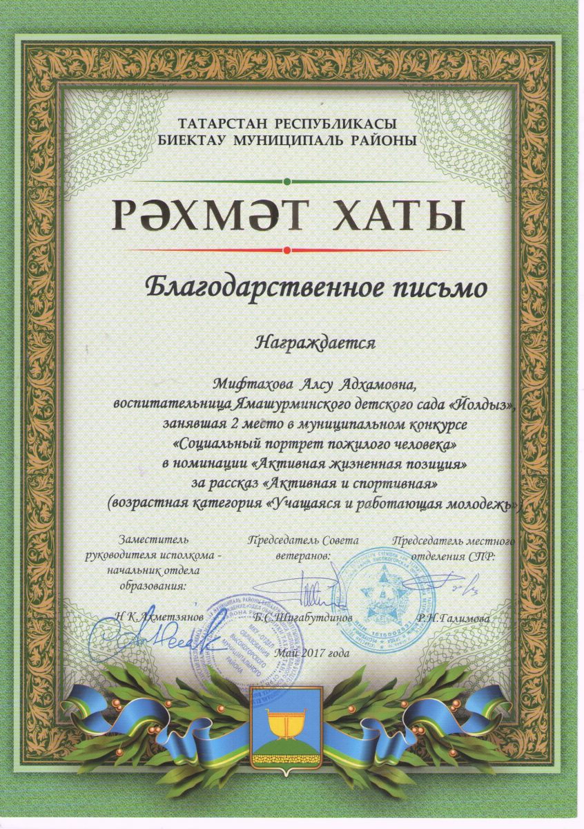 Грамота исполнительного комитета Высокогорского муниципального района за первое место