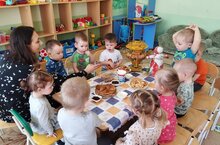 Важная задача педагогов детского сада — с раннего возраста приобщать детей к русским национальным традициям, неотъемлемой частью которых являются народные праздники. Вот и сегодня детей второй младшей группы воспитатель Людмила Тимиряева познакомила детей с традициями и обычиями праздника. Масленица это один из самых ярких, веселых, шумных и незабываемых праздников в году. Ребятки посмотрели презентацию, затем педагог познакомила детей с народными играми «Гори,гори ясно!», затем имитировали катание на лошадях. Уточнили, из чего делают блины: молоко, яйца, сахар, мука, соль. В завершении занятия ребятки полакомились блинами со сгущенкой и разучили стихотворение про Масленицу.