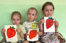Сегодня ребята средней группы "Жемчужинки" посвятили свой день замечательной ягодке - клубнике: рассматривали картину П. Кончаловского "Клубника", помогали гостю -Мишке собрать и найти среди множества других ягодок - спелую и вкусную клубнику, и в конце дня, создали целое поле клубники в технике рисования -