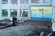 По программе «Доступная среда» работы выполняет фирма «Грант Ривер Газ» на сумму 850 тыс.рублей. Работы начаты 10.08.2015. По плану фирмы намечен ремонт основных входных групп школы. На сегодняшний день завершен демонтаж тамбура и бетонирование плиты крыльца.