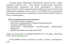 В рамках проекта Образование «Национальные проекты России», службы поддержки родителей «Әти - әнием ярдәме» государственным автономным образовательным учреждением для детей, нуждающихся в психологопедагогической и медико-социальной помощи «Центр психолого-педагогической реабилитации и коррекции «Росток» (далее - ГАОУ ЦППРК «Росток») проводятся бесплатные психологические консультации для родителей Республики Татарстан очно и в онлайн формате. Консультирование родителей по вопросам: - детско-родительских отношений; - возрастных и индивидуальных особенностей развития детей; - готовности к обучению в школе; - поведенческих, эмоциональных, интеллектуальных, мотивационных нарушений; - развития, обучения и воспитания детей с ОВЗ. Запись на консультацию по телефону 8(843)563-35-16 и по адресу электронной почты: metodrostok@gmail.com ГАОУ ЦППРК «Росток» находится по адресу: г.Казань, ул.Ак.Королева, д.4Б.