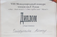 Гайфуллина Айсылу, ученица 10 класса МБОУ "Матюшинская СОШ", победитель муниципального этапа Международного конкурса им.Г. Тукая, участвовала в региональном этапе, который прошел 17 апреля в Доме актеров г. Казани. Конкурс был посвящен матерям. Учащиеся рассказывали отрывки из произведений, стихи о матерях. Айсылу представила вниманию жюри отрывок из произведения Амирхана Еники “Красота” и была награждена дипломом участника. Такие конкурсы воспитывают чувства любви к родному языку, культуре.