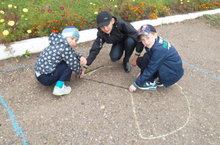 Прошло очередное занятие внеурочки по математике в 5 классе. Учитель математики Саттарова Надежда учила применять практические знания и умения в жизни. Учащиеся учились чертить окружность и делить его на части при помощи шнура. Эти умения они отрабатывали на пришкольном участке. Учащиеся, работая творчески, смогли сами составить свою геометрическую клумбу.