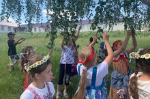 посвященный Троице. Праздник начался с рассказа об истории праздника, традициях и обрядах, которые мы узнали от наших родителей и бабушек. Вместе с ребятами мы водили традиционный хоровод, далее - обряд наряда березы цветными лентами и загадыванием желаний. Ребята каждый год с удовольствием «кумятся», плетут венки из березы и цветов. Дети с удовольствием играли в народные игры «Бег в мешках», «Горелки с платочком», «Ручеек». -