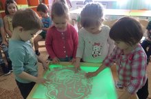 В старшей группе МБДОУ «Нижнеуслонский детский сад» воспитатель Ходинович М.Ю. использует современную, интересную методику - рисование песком на стекле.