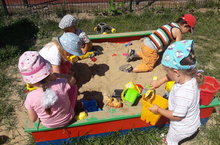 Дети знакомятся со свойствами песка (сухой, мокрый), постигают приёмы строительства из него. Действия с песком развивают мелкую моторику, ручную умелость. Создание и обыгрывание построек обеспечивает развитие детского творчества. Манипулятивные действия с песком вызывают у ребёнка чувство комфорта, удовольствия, радости, что благоприятно сказывается на работе всех функций и систем организма.