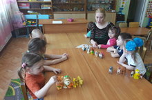 Ребята учились сравнивать, находить сходство и различие диких и домашних животных. Воспитатель давала общее представление о строении, внешнем виде, передвижении, питании и детенышах. Ребята старшей и подготовительной подгруппы рассматривали картины, игрушки и учились отвечать на вопросы воспитателя, делать простейшие выводы, высказывать предположения.Воспитанники младшей и средней подгруппы развивали умение различать контрастные размеры (большой-маленький). Пробовали выразительно имитировать голоса животных (мяу-мяу, пи-пи-пи, му-му) с разной интонацией.