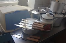 Поварешки, ложки, стол, плита и стулья,