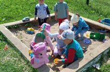 Сегодня дети младшей группы МБДОУ «Октябрьский детский сад» вооружившись ведерками, совочками, формочками и другими атрибутами с интересом экспериментируют с песком.