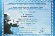 Ксения Тиханчук, ученица 4 класса фортепианного отделения Детской школы искусств, удостоена Звания Лауреата III степени Второго городского открытого конкурса имени Народного артиста РТ, Заслуженного деятеля искусств РФ и РТ, Лауреата Государственной премии имени Г.Тукая Энвера Бакирова и вместе со своим преподавателем Гульшат Шигабутдиновой награждена Дипломами и ценными подарками.